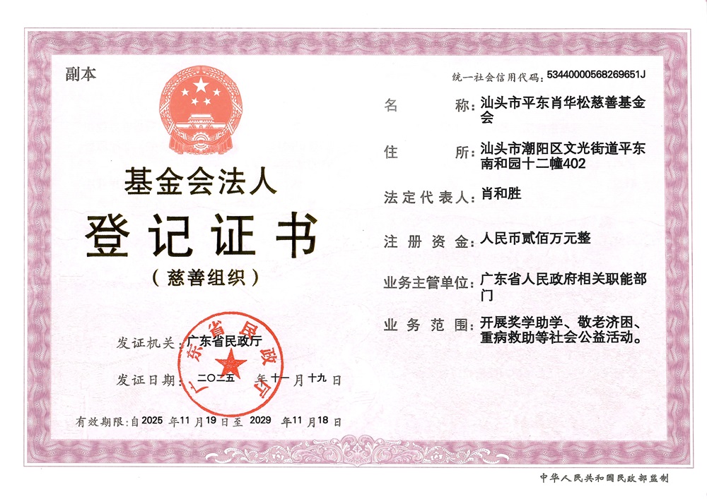 汕头市平东肖华松慈善基金会是一家在广东省民政厅登记注册的非公募基金会,2011年1月31日批准成立,创会会长肖华松先生。基金会的宗旨:支持公益慈善事业,促进文化教育建设。设立有“奖学、助学、敬老、济困、重病救助”五个慈善项目,并为社区无一技之长的困难家庭子女、残疾人免费技能培训。截至2023年8月,基金会共奖励大学生1126名、助学82人、敬老13651人次、慰问......[详情]