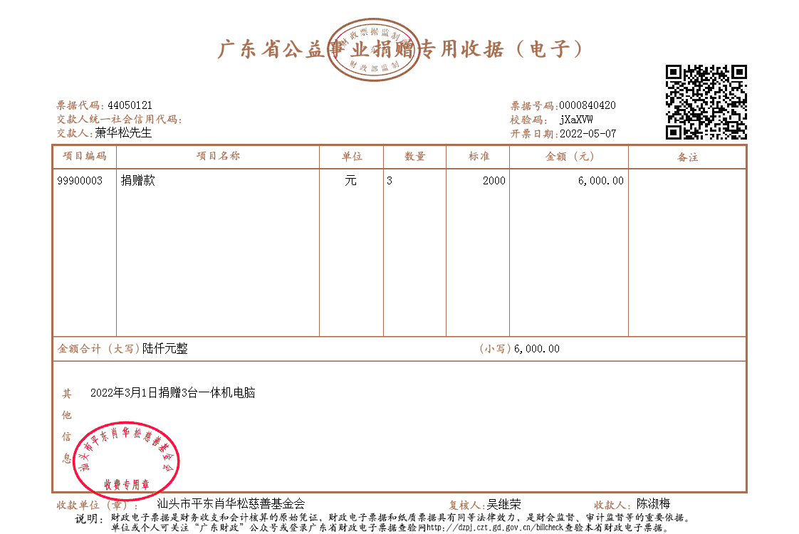| 20 | 萧华松先生 | 实物捐赠 | 当面交付 | 2022-05-07 | 6000.00 | 0000840420 |