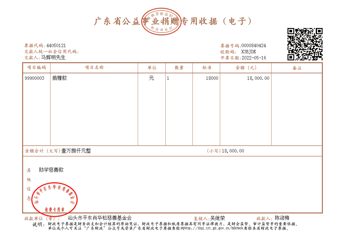 | 18 | 陈德贤先生 | 定向助学 | 现金支付 | 2022-05-16 | 6000.00 | 0000840422 |