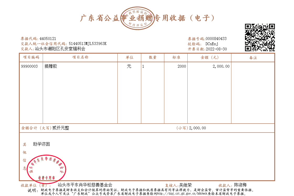 | 9 | 汕头市潮阳区孔安堂福利会 | 助学济困 | 现金支付 | 2022-08-30 | 2000.00 | 0000840433 |