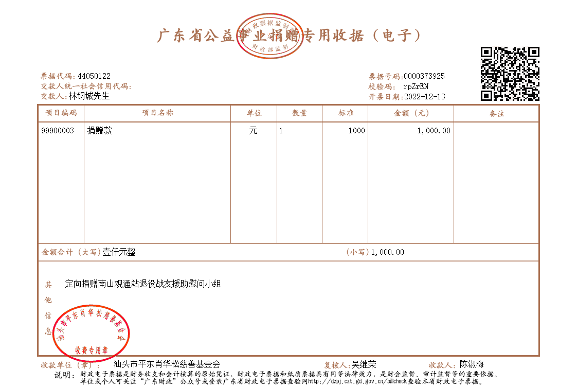 | 5 | 林钢城先生 | 定向捐赠 | 现金支付 | 2022-12-13 | 1000.00 | 0000373925 |