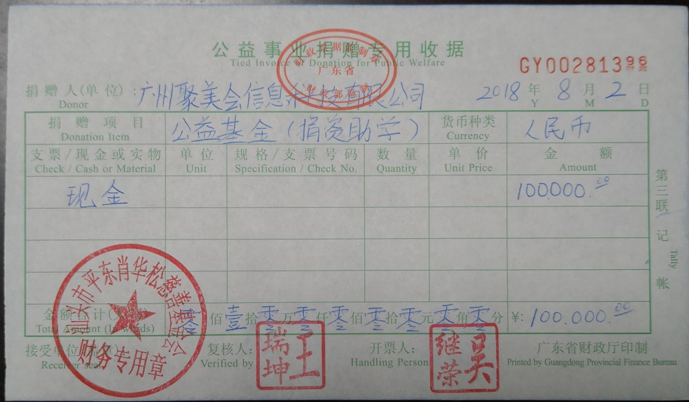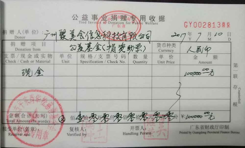 | 13 | 广州聚美会信息科技有限公司 | 货币 | 银行转账 | 2017-07-11 | 100000.00 | GY00281386 |