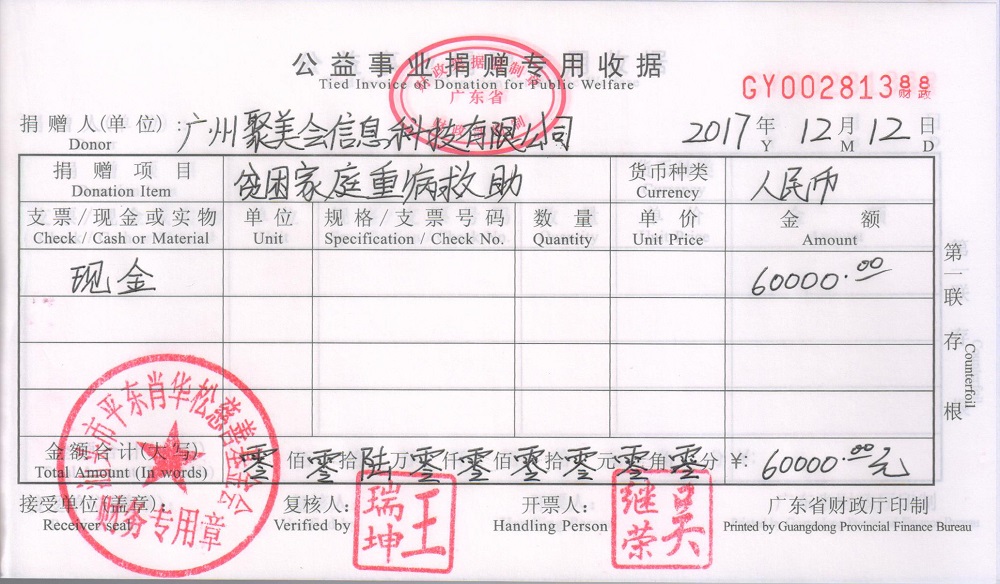 | 11 | 广州聚美会信息科技有限公司 | 货币 | 银行转账 | 2017-12-12 | 60000.00 | GY00281388 |