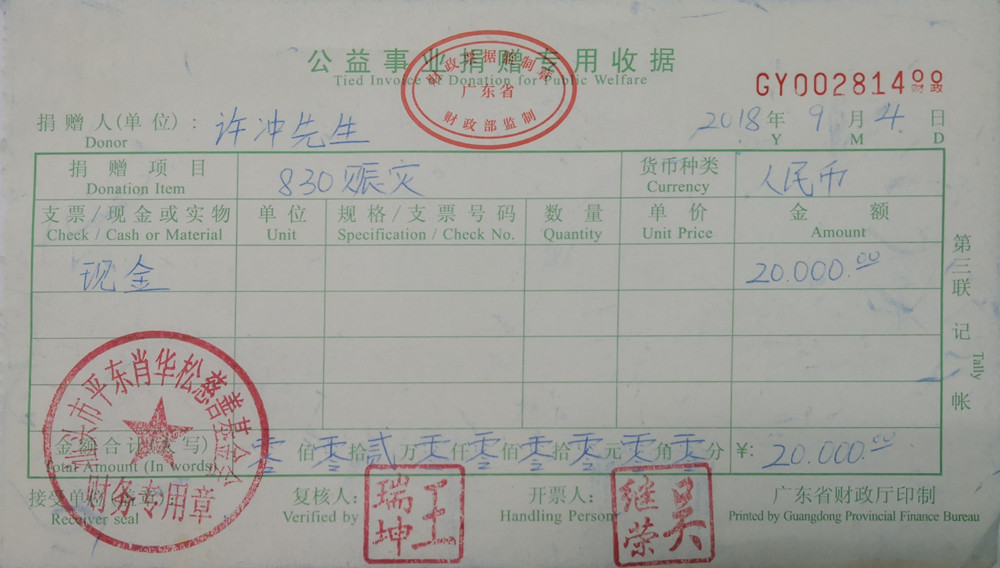 | 1 | 许冲先生 | 货币 | 银行转账 | 2018-09-04 | 20000.00 | GY00281400 |