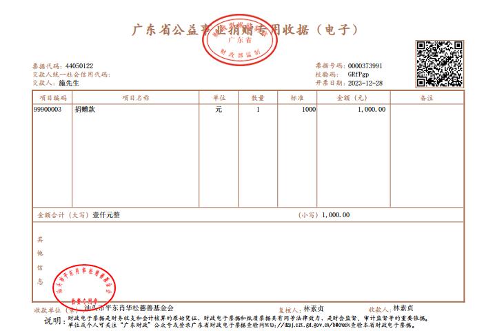 | 11 | 施先生 | 公益金 | 现金支付 | 2023-12-28 | 1000.00 | 0000373991 |