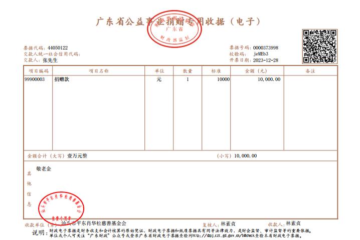 | 4 | 张先生 | 敬老金 | 现金支付 | 2023-12-28 | 10000.00 | 0000373998 |