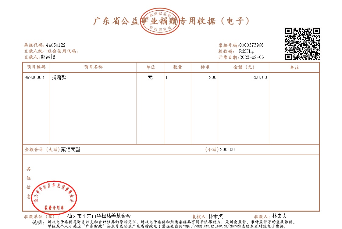 | 10 | 赵淑银女士 | 公益金 | 现金支付 | 2023-02-06 | 200.00 | 0000373966 |
