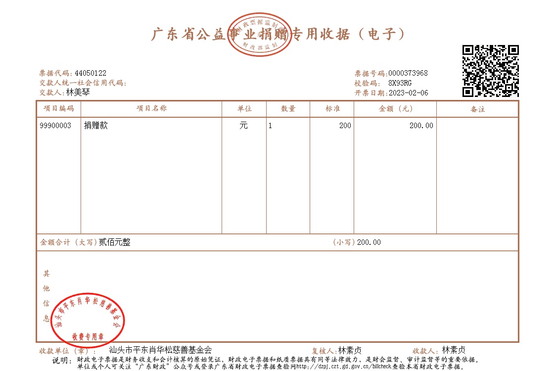 | 8 | 林美琴女士 | 公益金 | 现金支付 | 2023-02-06 | 200.00 | 0000373968 |