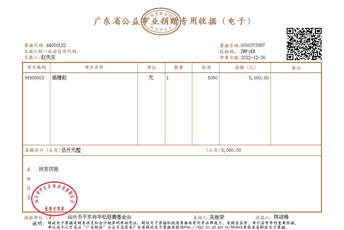 | 13 | 赵先生 | 济困 | 现金支付 | 2022-12-30 | 5000.00 | 0000373957 |