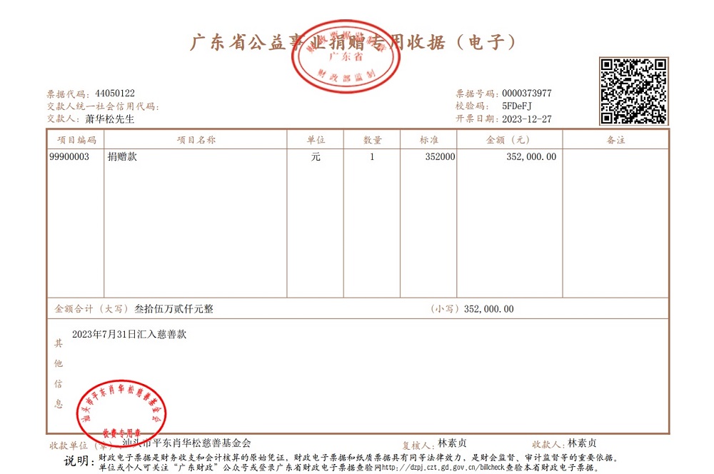 | 5 | 萧华松先生 | 公益金 | 银行转账 | 2023-12-27 | 352000.00 | 0000373977 |