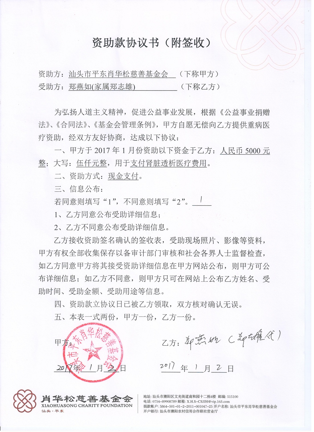 | 14 | 郑燕如 | 货币 | 现金支付 | 支付肾脏透析医疗 | 2017-01-03 | 5000.00 | | 20170102 |