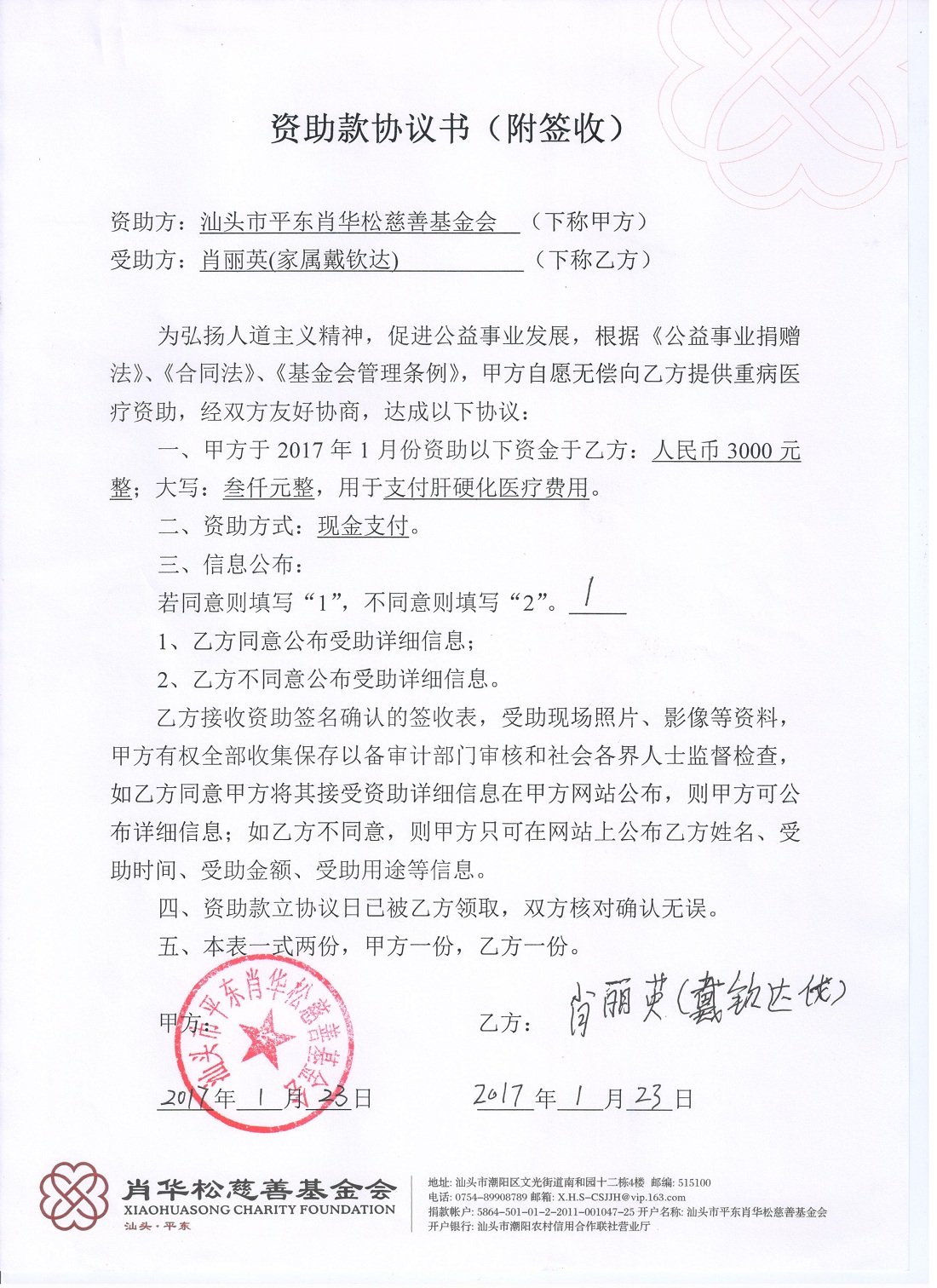 | 11 | 肖丽英 | 货币 | 现金支付 | 支付肝硬化医疗 | 2017-01-24 | 3000.00 | | 20170123 |