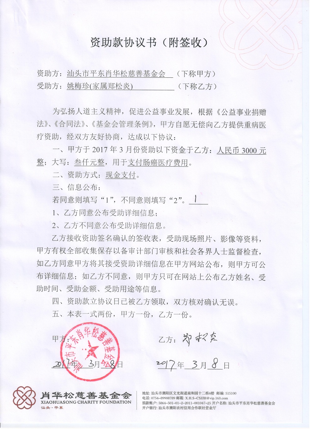 | 10 | 姚梅珍 | 货币 | 当面交付 | 支付肠癌医疗费用 | 2017-03-08 | 3000.00 | | 2017030801 |