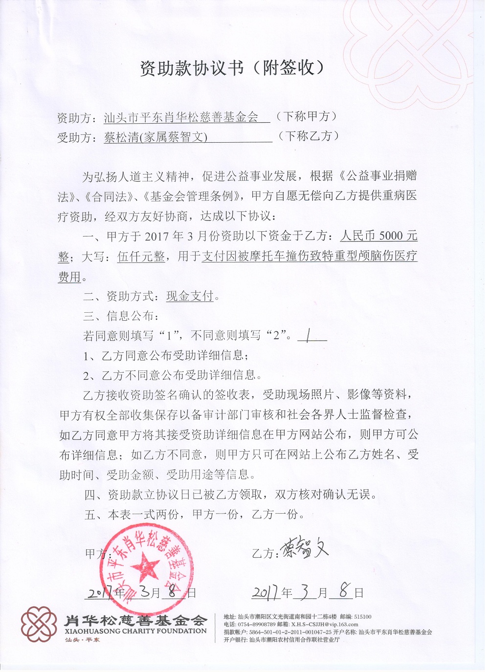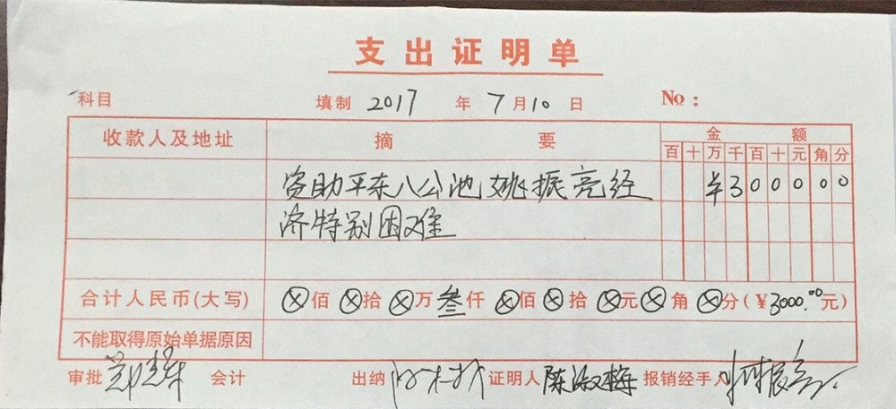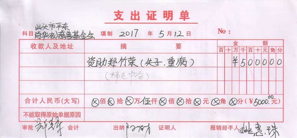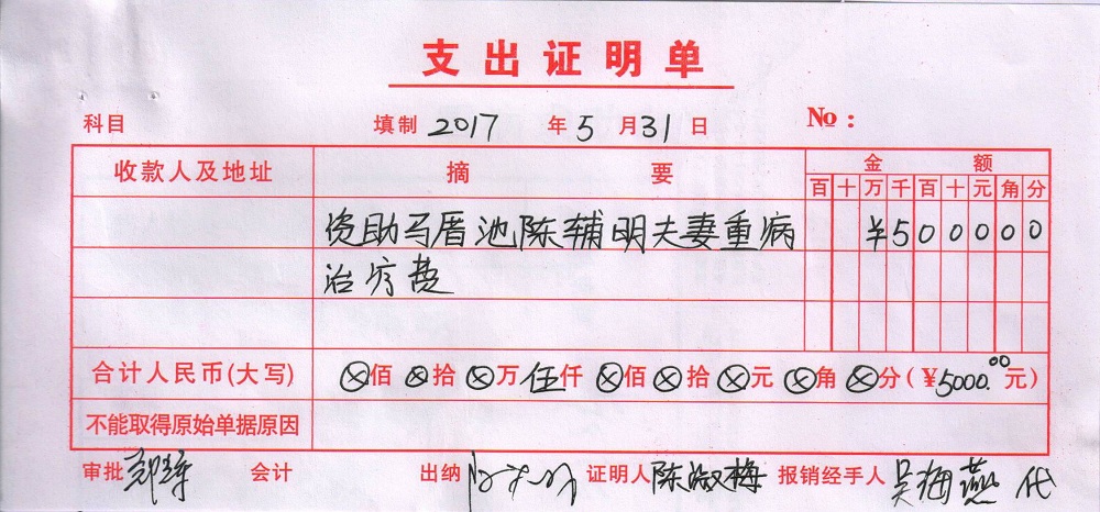 | 5 | 陈辅明夫妻 | 货币 | 当面交付 | 重病救助 | 2017-05-31 | 5000.00 | | 20170531 |