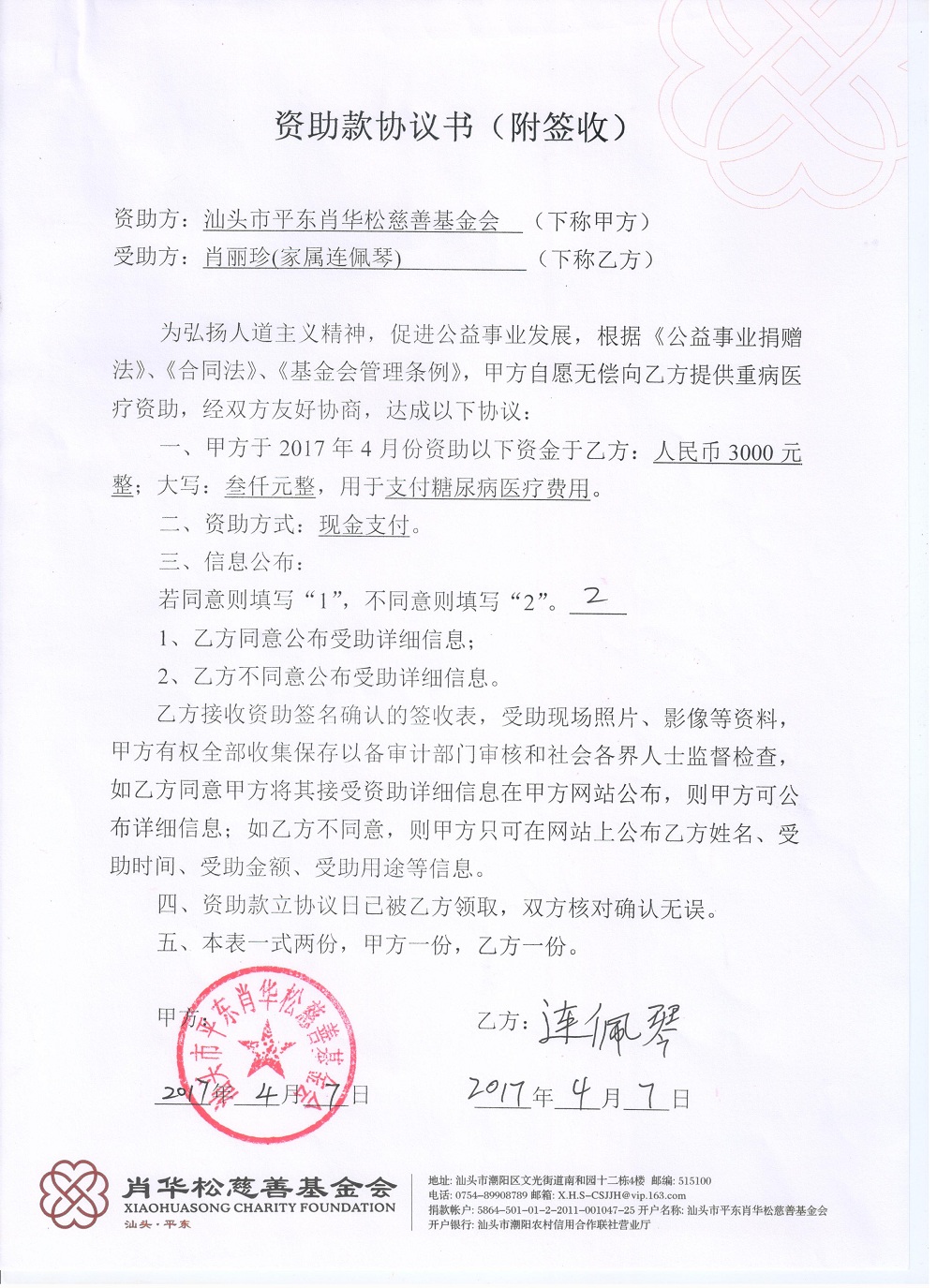 | 7 | 肖丽珍 | 货币 | 当面交付 | 重病救助 | 2017-04-07 | 3000.00 | | 2017040702 |