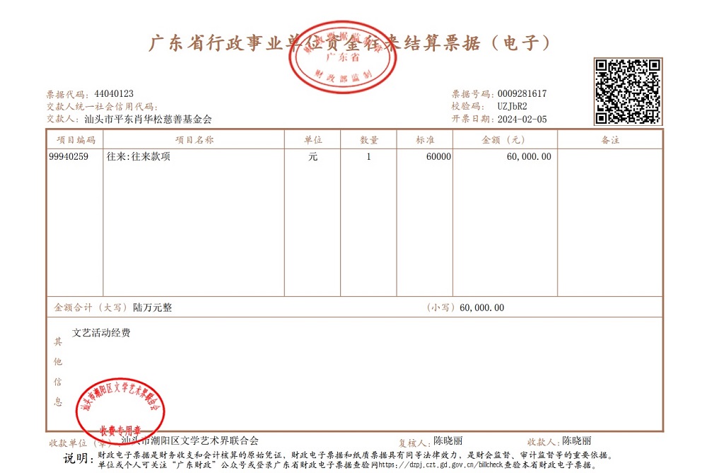 | 17 | 汕头市潮阳区文学艺术界联合会 | 货币 | 银行转账 | 2024-02-05 | 60000.00 | 0009281617 | ||