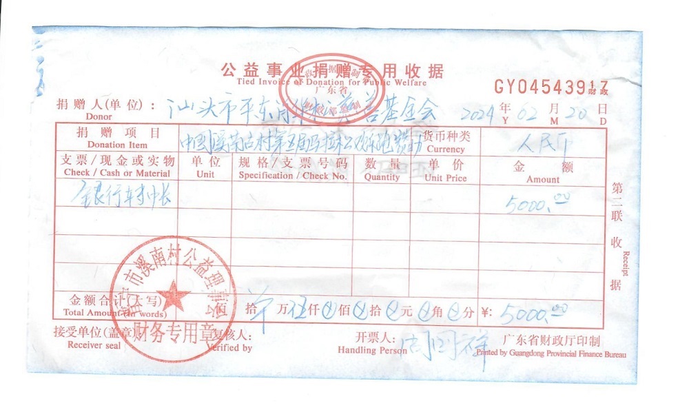| 14 | 普宁市溪南村公益理事会 | 货币 | 银行转账 | 公益赞助 | 2024-02-20 | 5000.00 | 财政GY04543917 | |