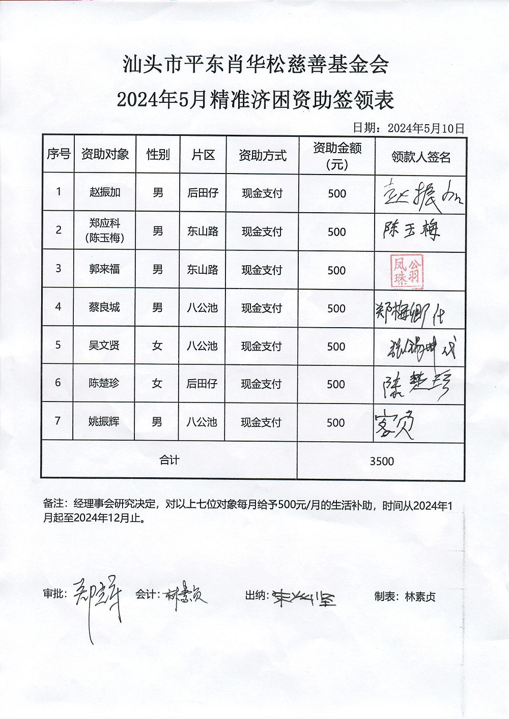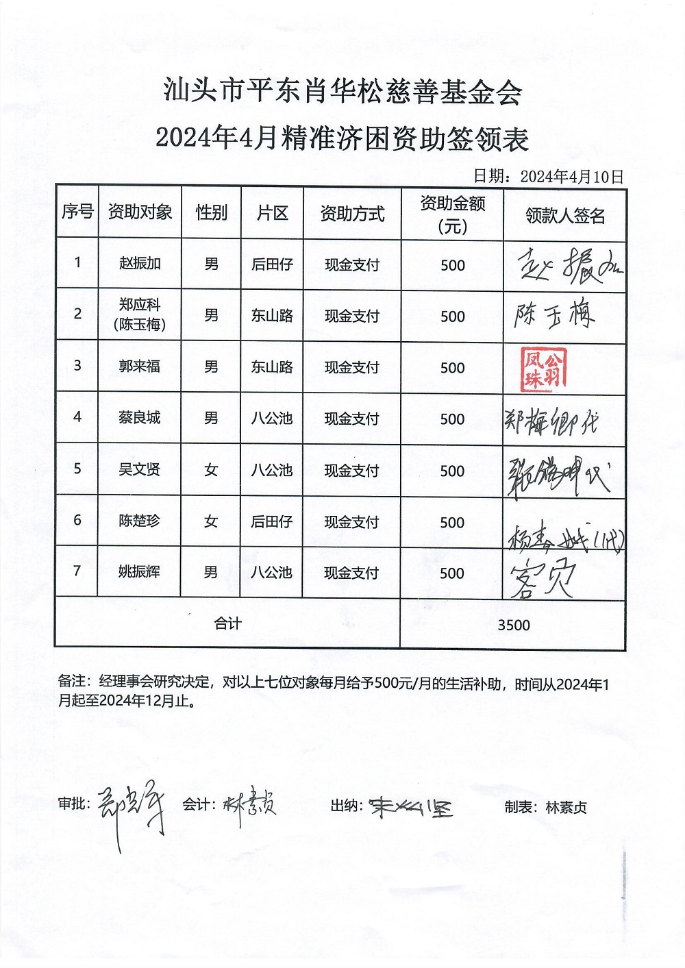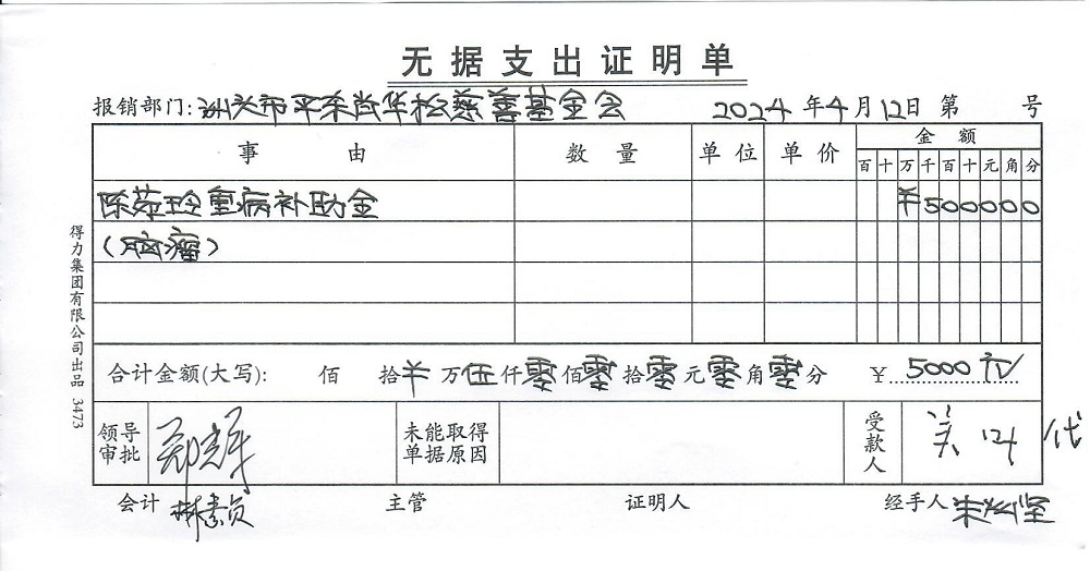 | 7 | 陈苑玲 | 货币 | 现金支付 | 重病救助 | 2024-04-12 | 5000.00 | 20240412 | |