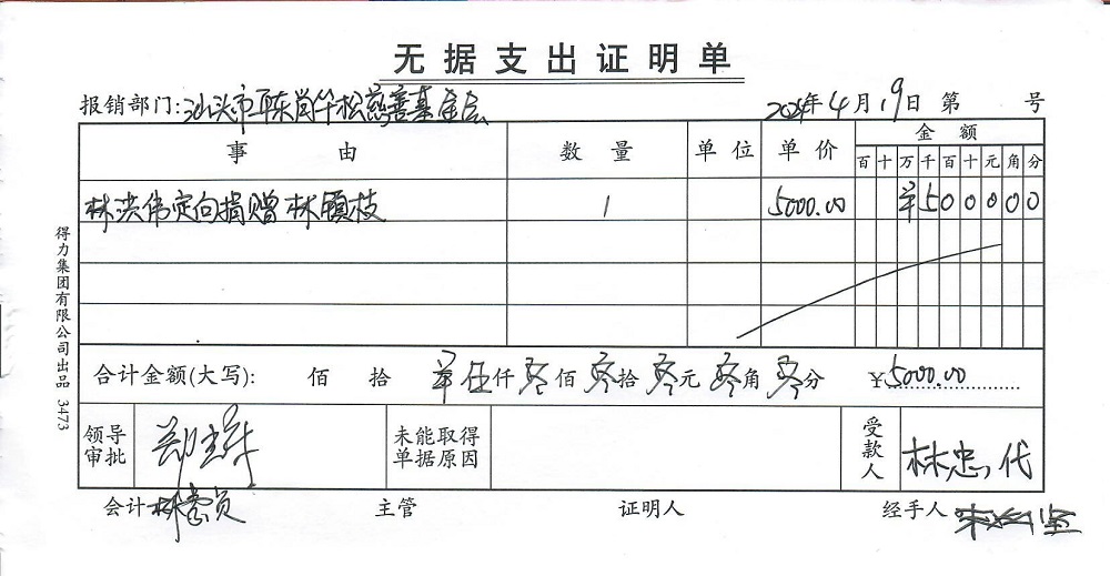 | 5 | 林镇枝 | 货币 | 现金支付 | 定向捐赠 | 2024-04-19 | 5000.00 | 20240419 | 2024041902 |