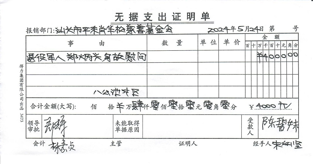 | 2 | 郑炳兴 | 货币 | 现金支付 | 拥军优属 | 2024-05-24 | 4000.00 | 20230801 | 2024052402 |