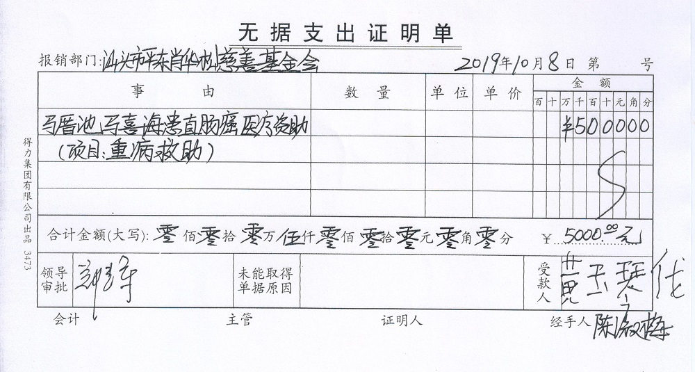 | 16 | 马喜海 | 货币 | 当面交付 | 重病救助 | 2019-10-08 | 5000.00 | | 20191008 |