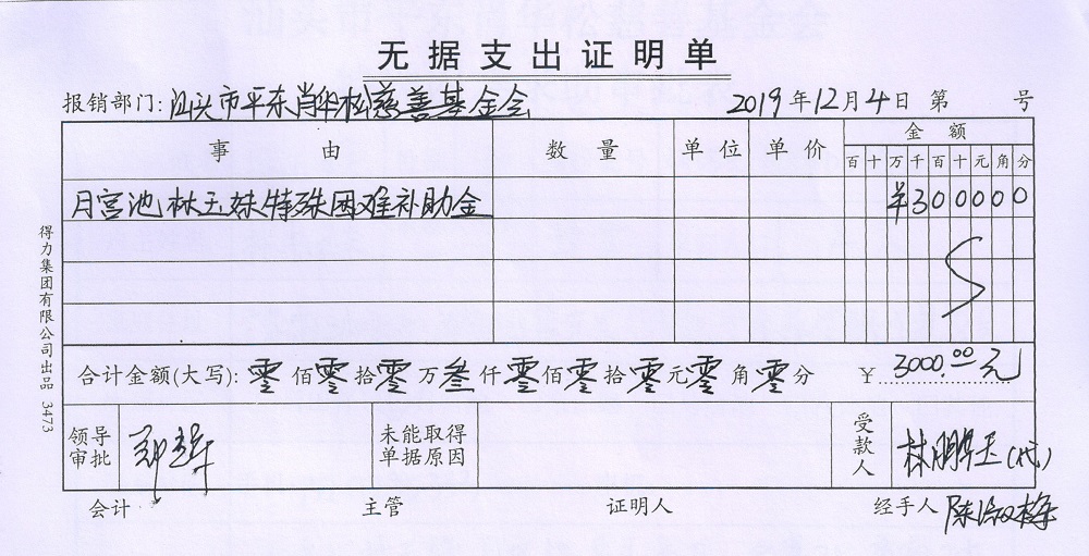 | 14 | 林玉妹 | 货币 | 当面交付 | 特殊困难 | 2019-12-04 | 3000.00 | | 20191204 |