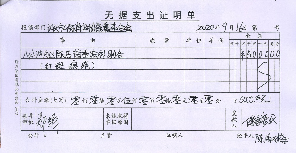 | 6 | 陈洁茵 | 货币 | 当面交付 | 重病救助 | 2020-09-16 | 5000.00 | | 20200916 |