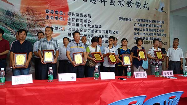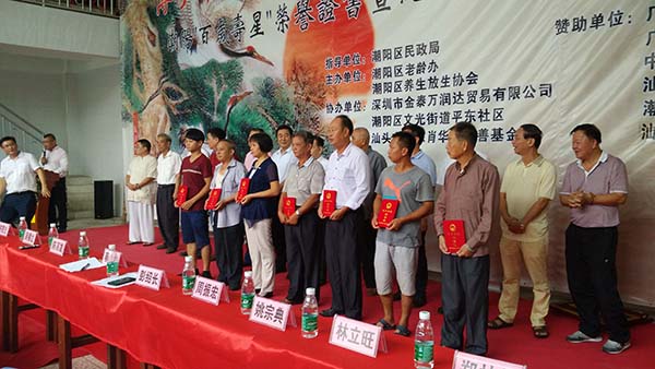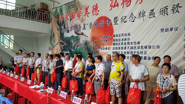 本次活动为52位潮阳“百岁寿星”颁发了荣誉证书和“期颐鸿福”纪念牌匾,并慰问了其中六位贫困寿星。广州市润铧投资有限公司董事长肖华松先生向“百岁寿星”赠送了礼金和慰问金,深圳市金泰万润达贸易有限公司董事长陈高发先生向“百岁寿星”赠送了礼品。
